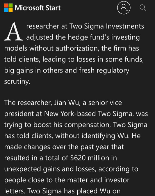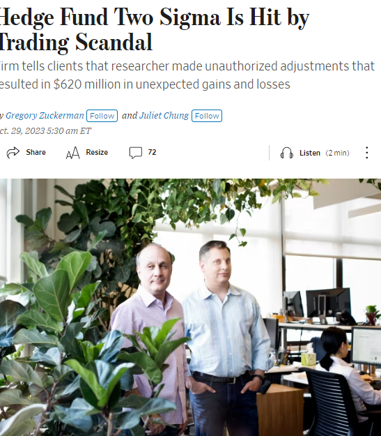根据早前多家媒体报道,Two Sigma在2023年发现模型异常。公司告诉客户,一名研究员在未获授权的情况下私自修改交易模型,导致部分基金出现巨额亏损,部分基金反常盈利,并引起监管部门关注。