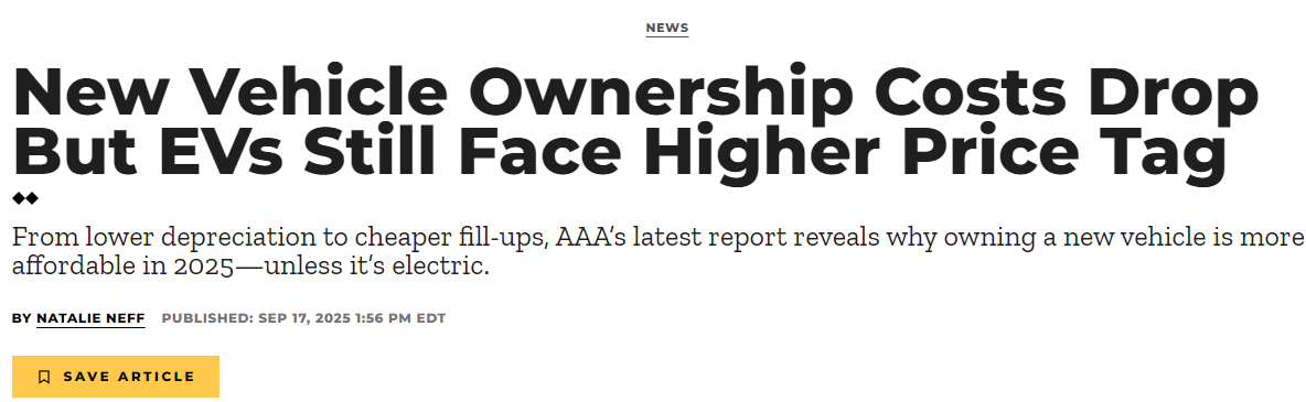 尽管电动车在维护成本上确有优势,但多数消费者最终看重的是总体开销和驾驶体验。AAA指出,这也是燃油车在美国市场依旧占据主流的原因之一。