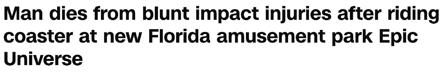 在奥兰多环球影城最新主题公园,一名男子在乘坐过山车后失去意识并最终死亡。当地法医周四表示,死因是钝器撞击伤。
