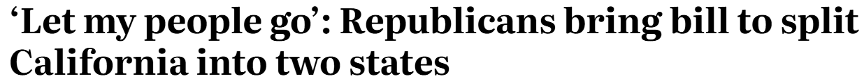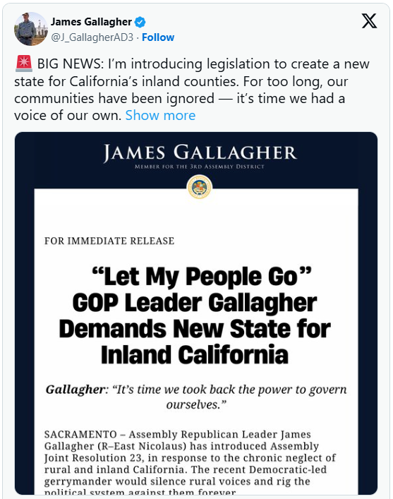 共和党众议院领袖詹姆斯·加拉格尔(James Gallagher)提出了一项联合决议,启动将加州按照沿海与内陆县划分的程序,以回应民主党人为进一步削减共和党在美国众议院席位而设计的选区划分。