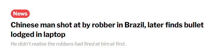 在巴西圣保罗(São Paulo)出差的一名华人男子,经历了一场堪称“死里逃生”的抢劫。他的苹果笔记本电脑意外成为救命护盾——挡下了飞来的子弹。