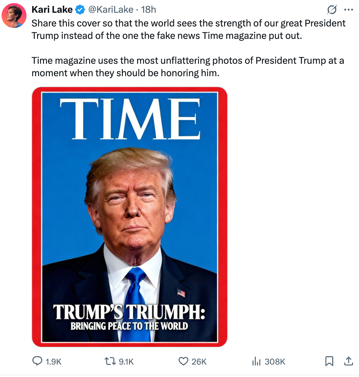 在X上,特朗普的支持者卡里·莱克(Kari Lake)——现任美国全球媒体署代理首席执行官——发布了一张伪造的“修正版”封面。