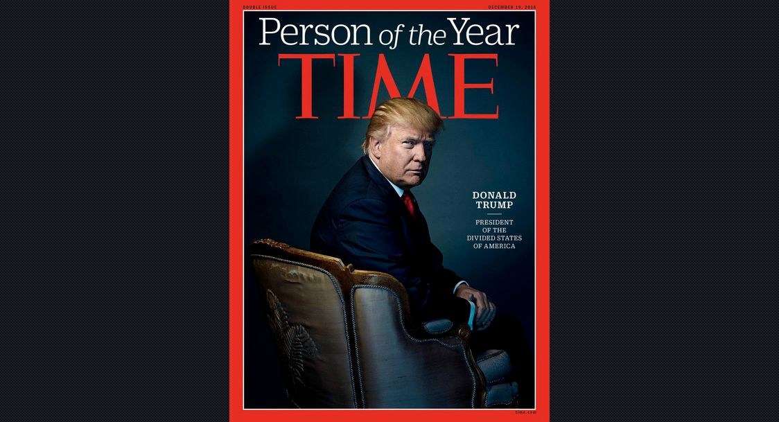 2016年,《时代》将他评为“年度人物”(Person of the Year),理由是他“重塑了美国政治现实”。那张封面上,他端坐在金色椅子上,背对国旗,阴影笼罩在他身后——评论家称那是“历史上最有暗示性的一次构图”。