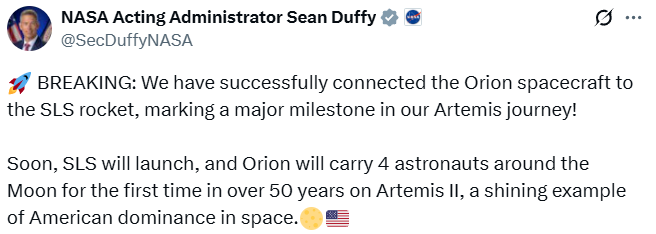 达菲表示,此举标志着“阿尔忒弥斯2号”任务迈出重要一步,飞船将搭载4名宇航员执行绕月飞行任务,这将是美国50多年来以来首次将宇航员送往月球轨道。