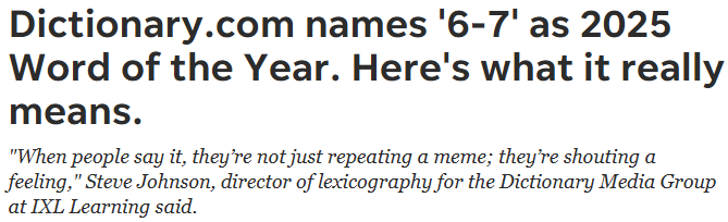 “它既是一种内部玩笑,也是一种社交信号,更是一种表演。”Dictionary Media Group的词典编纂总监史蒂夫·约翰逊(Steve Johnson)在新闻稿中表示。“当人们说‘6-7’时,他们并不仅仅是在复述一个网络梗,而是在喊出一种情绪。它是最早一批可以作为感叹词使用的年度词汇之一——一种能在人们真正确定其含义之前,就凭能量与共鸣传播开来的词。”