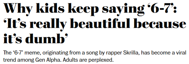 “6-7”是2025年的“23Skiddoo”吗?“通常,当报纸或学者开始讨论这些现象时,它们的热度早已过去了。”德州东A&M大学语言学教授萨尔瓦托雷·阿塔多(Salvatore Attardo)说。“网络迷因是一种时尚,存在的时间很短,然后就消失。”