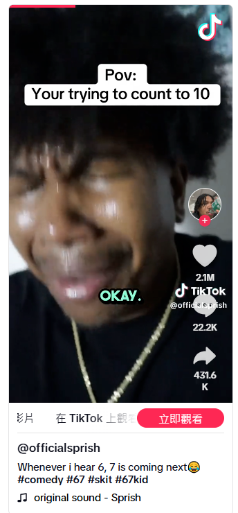 21岁的杰登·塔图姆(Jayden Tatum)是霍华德大学的大四学生,以“Sprish”的名义创作内容。今年9月初,他拍了一段视频,讲的是一个人每次数数到10时,都忍不住做“6-7”这个动作,灵感来自他的弟弟。这段视频已有1840多万次点击,成为他迄今最成功的作品。