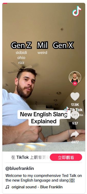 布鲁·富兰克林(Blue Franklin)是一名创作者,他制作的视频旨在“翻译”从α世代到Z世代再到千禧一代的俚语。例如,“No cap is no lie is for real(意思是不骗人,是真的)”以及“Skibidi is chaotic is random(Skibidi代表混乱和随机)”。
