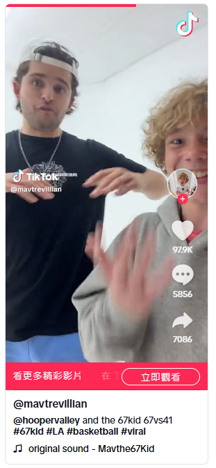 也许最知名的“6-7”视频来自一个12岁的男孩梅弗里克·特雷维连(Maverick Trevillian),他在网红坎·怀尔德(Cam Wilder)组织的篮球赛中,兴奋地与朋友们一起高喊“6-7”。他手里拿着手机,穿着一件宽大的灰色连帽衫,金发被打理成所谓的“冰淇淋头”。特雷维连完美地体现了α世代的那种兴奋感。视频迅速在网络上走红,他也因此被称为“6-7男孩”。
