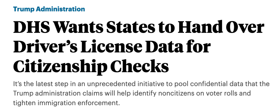 今年早些时候,DHS已将数百万美国人的社会安全号码(SSN)数据导入SAVE系统,使官员首次能对选民名单进行批量搜索。随后,护照与签证信息也被加入其中——而现在,驾照数据库正成为最新目标。