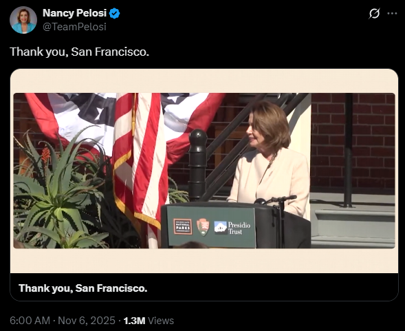 佩洛西通过社交媒体发布视频,表达了她对旧金山的深厚情感:“在我曾担任过的所有职务中,能站在众议院的讲台上,说出‘我代表旧金山人民发言’,是我一生最大的荣誉。”