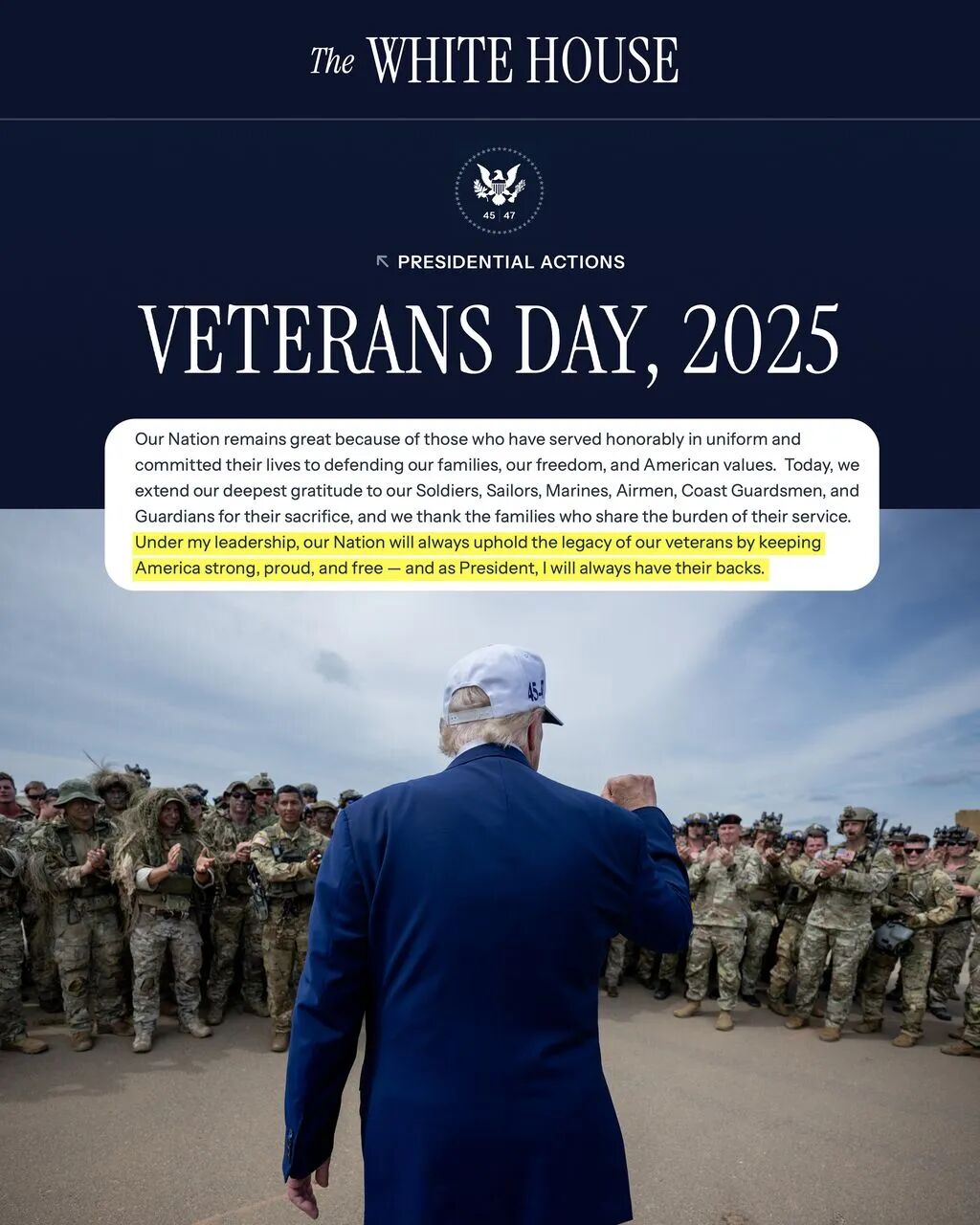 #特朗普总统 在X/推特上表示:“值此退伍军人节,我们表达感激之情,并再次致力于表彰他们的奉献,传承他们的精神,给予每位退伍军人应得的忠诚、尊重与支持,这是他们赢得的,也是他们理应享有的。”