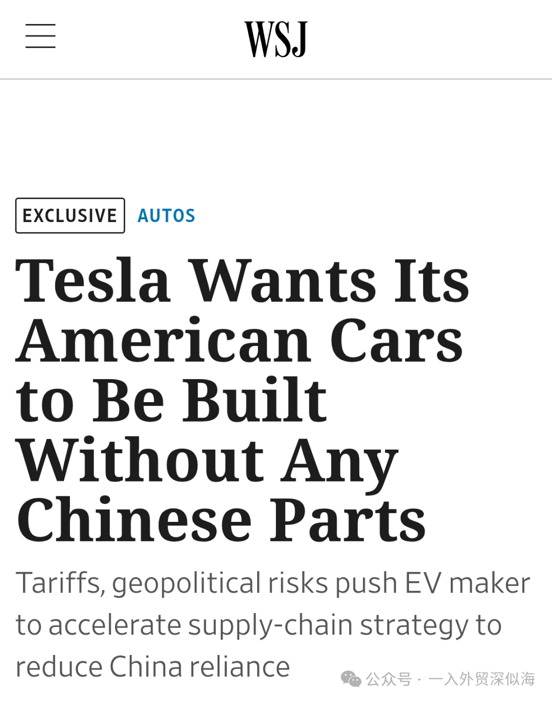 ●特斯拉要求供应商在美国组装的车辆中,完全排除中国制造的零部件(包括材料和组件)。