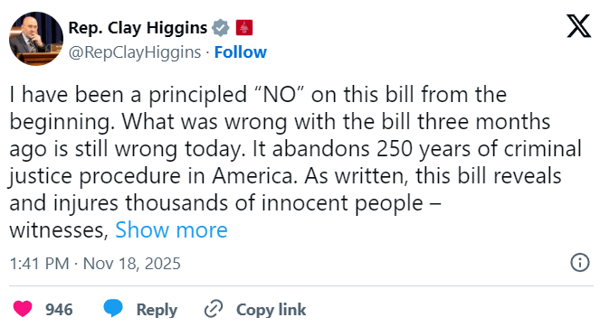 唯一投下反对票的,是路易斯安那州共和党众议员Clay Higgins。他在社交平台上解释称,他反对的理由是: