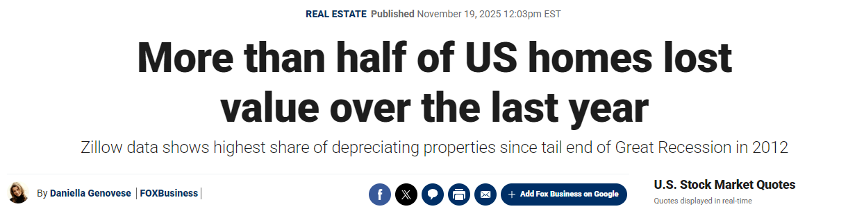 美国房市正在经历一轮明显的降温。根据Zillow最新发布的全国房产数据,截至2025年10月,全美 53%的房屋在过去一年里估值下降,这是自2012年房市泡沫破裂尾声以来最高的贬值比例。这意味着目前美国市场中,每两套房子,就有一套在掉价。