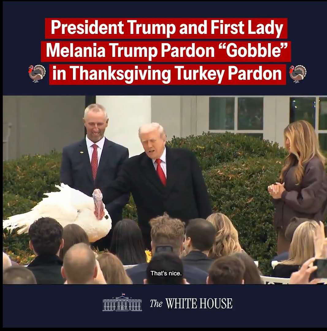 當地時間11月25日,根據白宮的傳統,特朗普總統和第一夫人於玫瑰園主持了年度火雞赦免儀式,赦免了2025年美國國家感恩節火雞Gobble(咯咯)和Waddle(晃晃)。