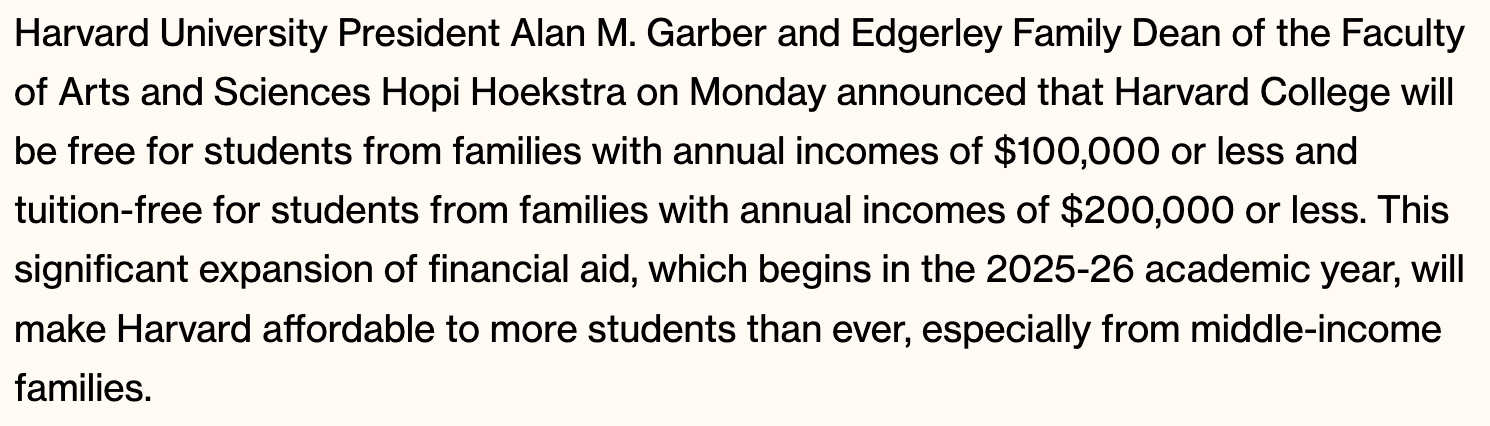 💰哈佛大学:家庭年收入10万以下,孩子可获得全额学费+住宿资助;年收入20万以下,学费全免;