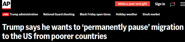 自白宫附近发生枪击事件以来,政府官员已承诺重新审查数百万合法移民,以此为过去10个月减少移民人口的行动加码。周四深夜,在那篇冗长的社交媒体帖子中,川普声称,数以百万计出生于美国以外、目前居住在美国的人,应为美国社会诸多弊病承担很大一部分责任。