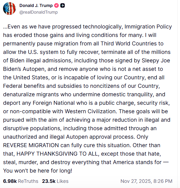 “我将永久停止所有第三世界国家的移民,以便让美国的社会体系全面恢复。”川普在他的Truth Social平台上发表的一篇长文中写道。
