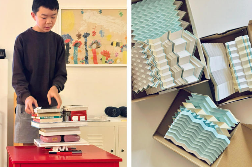 为了验证设计,他手工折叠了54种结构变化,并进行了108次实验。实验过程中,他逐步增加重量测试折纸承载能力。