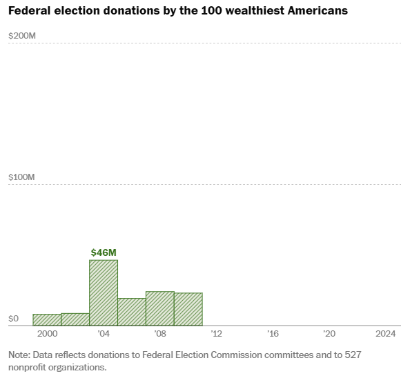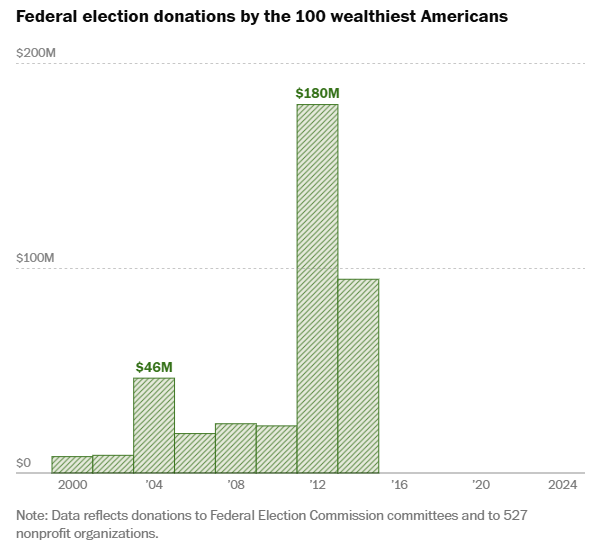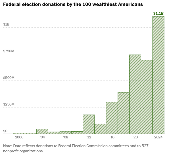 2000年,按《华盛顿邮报》根据OpenSecrets数据的分析,美国最富有的100人对联邦选举的捐赠仅占总成本的约0.25%。到2024年,尽管选举成本大幅上升,但他们的捐款比例却达到了约7.5%。换句话说,去年全国选举中,每花费的13美元中,就有1美元来自少数最富有的人。