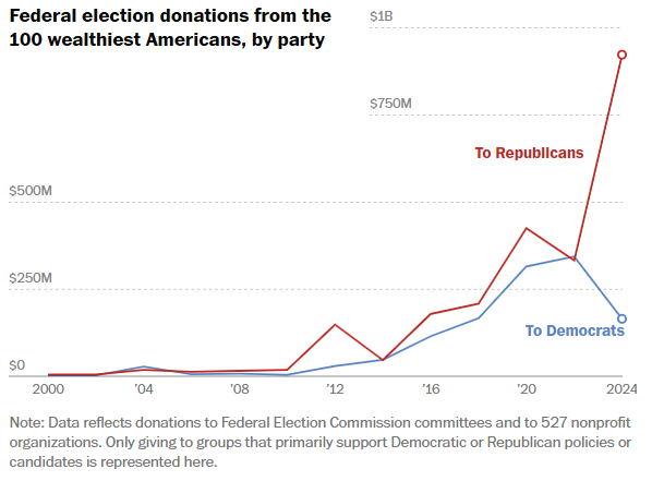 埃隆·马斯克是这一变化最明显的例子。他在2024年的政治支出增加中占了相当大的一部分,为支持川普及其他共和党人在联邦和州选举中捐出2.94亿美元。还有几十位科技或金融领域的亿万富翁加入了他的行列,他们总共向共和党捐赠的金额比向民主党捐赠的金额多出约5.09亿美元。