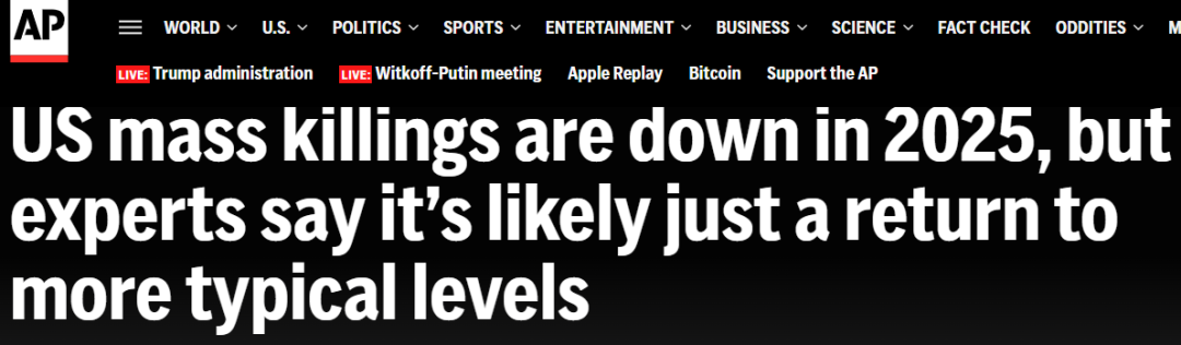 大規模殺戮事件定義為在24小時內造成4人或以上死亡(不包括兇手)的案件,由美聯社和《今日美國》與東北大學共同維護的資料庫進行追蹤。負責管理該資料庫的福克斯說,今年的大規模殺戮事件比2024年減少了約24%,而2024年相較2023年也下降了約20%。