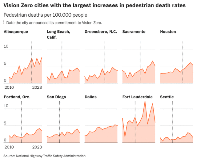 其中包括新墨西哥州的阿尔伯克基,过去5年里行人死亡率几乎翻倍,而该市正是在那一时期宣布加入“零愿景”的。加州的长滩、萨克拉门托以及北卡罗来纳州的格林斯伯勒也在其列。全国范围内,自2010年至2023年,年度行人死亡人数激增70%,执法机构仍把机动车通行效率放在首位。
