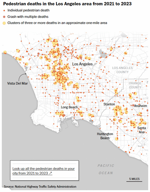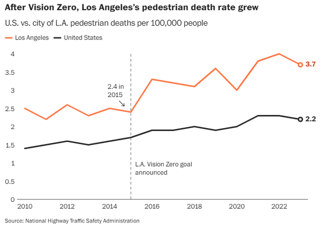 洛杉矶是最早在2015年采纳“零愿景”的城市之一,承诺今年消除交通死亡事故。然而,实际情况却恰恰相反。根据加州大学伯克利分校的全州交通数据,自2015年到2024年,行人遭汽车撞击死亡的人数增加了60%以上,从97人上升到158人。