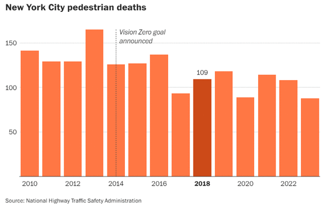 纽约市降低了限速、增设了摄像头,最成功但充满争议的举措是限制曼哈顿下城的汽车流量。该市在2014年宣布“零愿景”目标前,平均每年有141名行人死亡,此后平均每年为111人。新泽西州霍博肯专注于移除靠近人行横道、阻挡司机视线的停车位,霍博肯已实现连续8年无交通死亡事故。