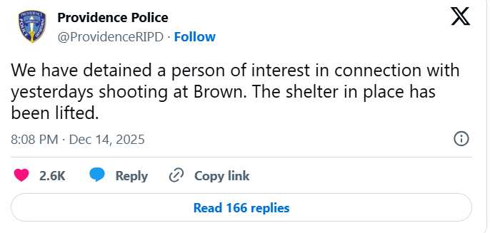 据普罗维登斯警察局(Providence Police Department)发言人Kristy DosReis表示,周日凌晨,一名与布朗大学致命大规模枪击案有关的“重点关注对象”已被警方拘留。