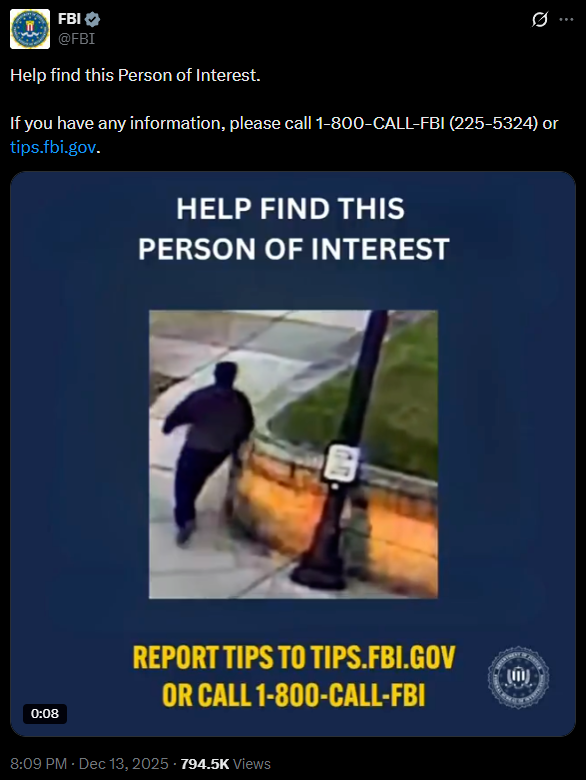 在该人员被拘留之前,FBI及其他执法机构曾公布一段短视频。视频中,一名男子身穿深色衣物,疑似戴着连帽外套,沿Hope Street行走并向北转弯。
