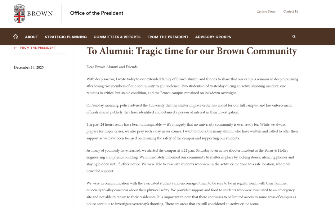 布朗大学校长Christina H.Paxson在美东时间凌晨2点前发布声明,称这一天是“毁灭性的枪支暴力之日”。