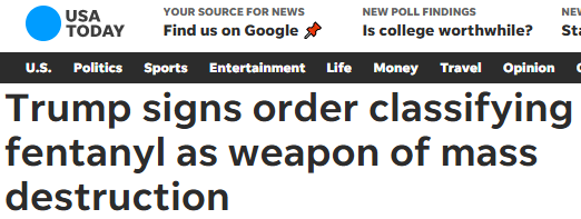行政命令写道:“非法芬太尼更接近一种化学武器,而非麻醉品。仅2毫克就足以致人死亡,而这几乎是无法察觉的数量,仅相当于10至15粒食盐。已有数十万美国人死于芬太尼过量。”