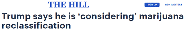 川普周一还表示,其政府正在考虑将大麻重新归类为危险性较低的药物。几天前的一个报道称,川普预计将签署一项行政命令,指示相关机构尽快推进重新归类事宜。