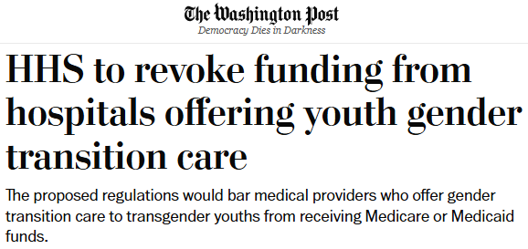 据华盛顿邮报12月18日报道 川普政府正着手大幅收紧针对青少年的性别转换医疗服务。政府周四提出新规,拟将向儿童和青少年提供包括激素治疗、青春期阻断剂或乳房切除等手术在内相关服务的医疗机构,逐出主要联邦医疗保险项目。
