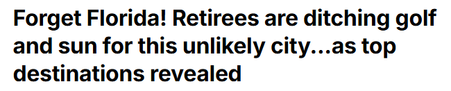据每日邮报12月21日报道 在美国,谈及“退休”,许多人脑海中浮现的仍是棕榈树、高尔夫球车、低税率与远离严冬的悠闲生活。多年来,退休人士纷纷逃离东北部等生活成本高昂的地区,南下或西迁,追逐更温暖的气候、更低的房价与更宁静的环境,即便这意味着远离子女与孙辈。