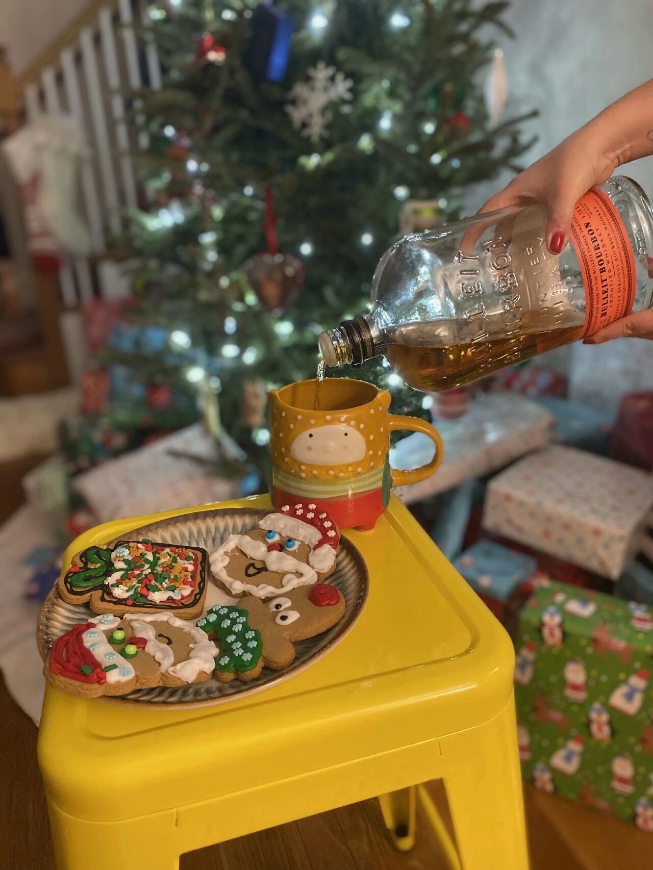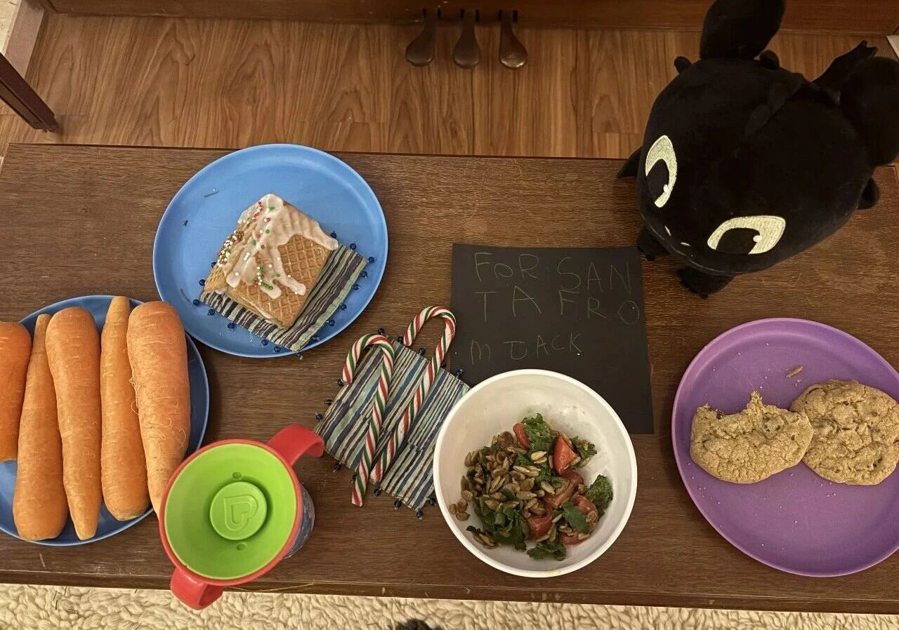 给圣诞老人留饼干也是许多美国家庭的传统,这样他在给各家送礼物时可以顺便吃点儿小点心。我们还会给驯鹿准备胡萝卜。我也会准备一小份沙拉,鼓励圣诞老人吃得更健康,不过他一般都不怎么碰!