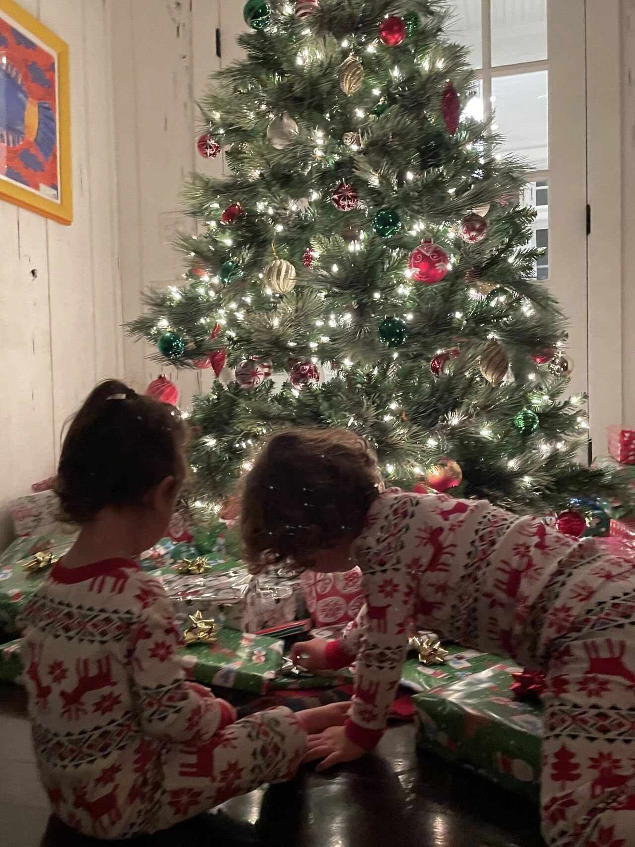 圣诞节当天早上,孩子们会起得特别早,迫不及待去看圣诞树下有什么新礼物。除了圣诞老人的礼物,我们家庭成员之间也会互送礼物,在美国的家人也会寄来礼物。我们常常就穿着睡衣,把礼物一个个拆开,然后给美国的家人打电话,祝他们圣诞快乐。到了圣诞节这天,我喜欢放松一下,不做饭,所以我们通常会出去吃一顿!
