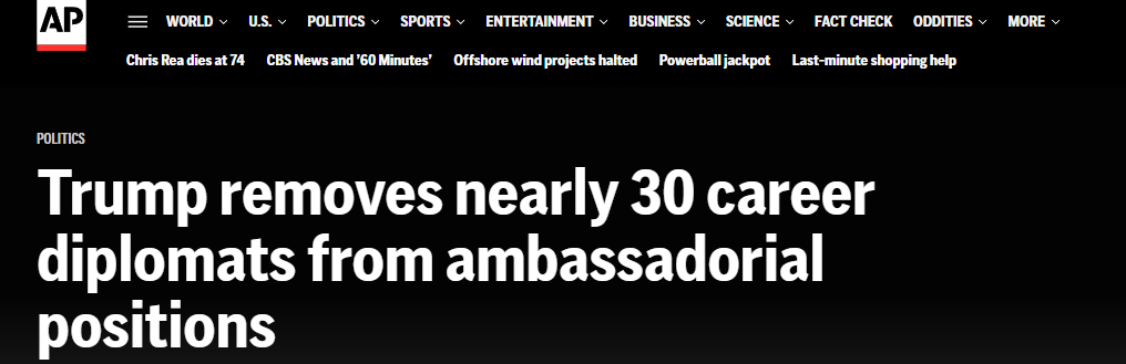 據今日美國12月24日報道 川普政府正在召回近30名職業外交官,涉及大使及其他高級使館職位。此舉旨在重塑美國的海外外交姿態,確保關鍵職位由完全支持總統川普“美國優先(America First)”議程的人員擔任。