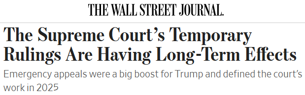 隨著川普的政策攻勢在下級法院頻頻受阻,政府二十多次緊急向最高法院求助,要求在相關訴訟緩慢推進期間立即讓行政命令和其他白宮優先事項生效。通常,這意味著解除聯邦地區法官為維持現狀而發佈的初步禁令。