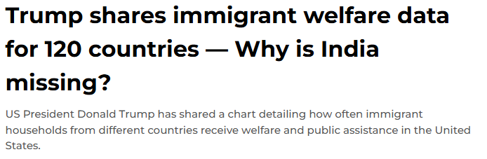 据financialexpress1月4日报道 美国总统唐纳德·川普周日分享了一份图表,显示来自不同国家的移民家庭,在美国领取福利和公共援助的比例。