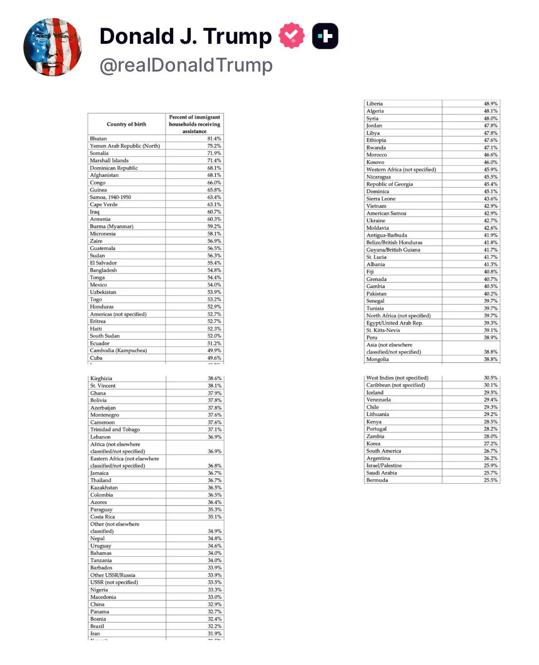 根据川普分享的数据,一些国家的移民家庭福利领取率非常高。不丹位居榜首,81.4%的移民家庭领取援助。