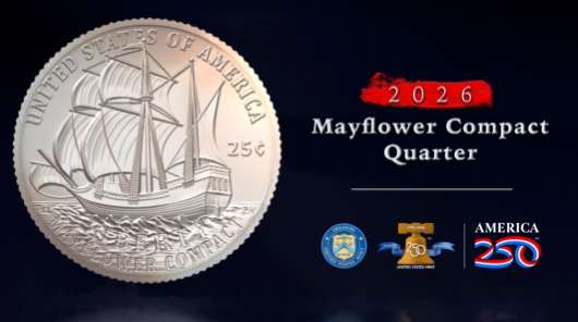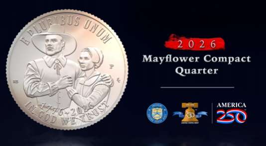 這款名為《五月花號公約》25美分硬幣(Mayflower Compact Quarter)是2026年推出的五款全新25美分硬幣設計中的第一款。該收藏型硬幣圖案為一男一女兩名清教徒,站在寫有“E Pluribus Unum”(意為“合眾為一”)字樣的旗幟下。