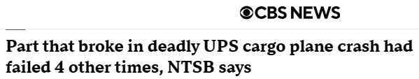 据CBS新闻1月15日报道 本周公布的最新美国国家运输安全委员会(NTSB)调查结果显示,去年在肯塔基州坠毁并造成15人死亡的UPS公司货机的部件存在缺陷,而波音公司早在14年前就已指出该部件存在缺陷。