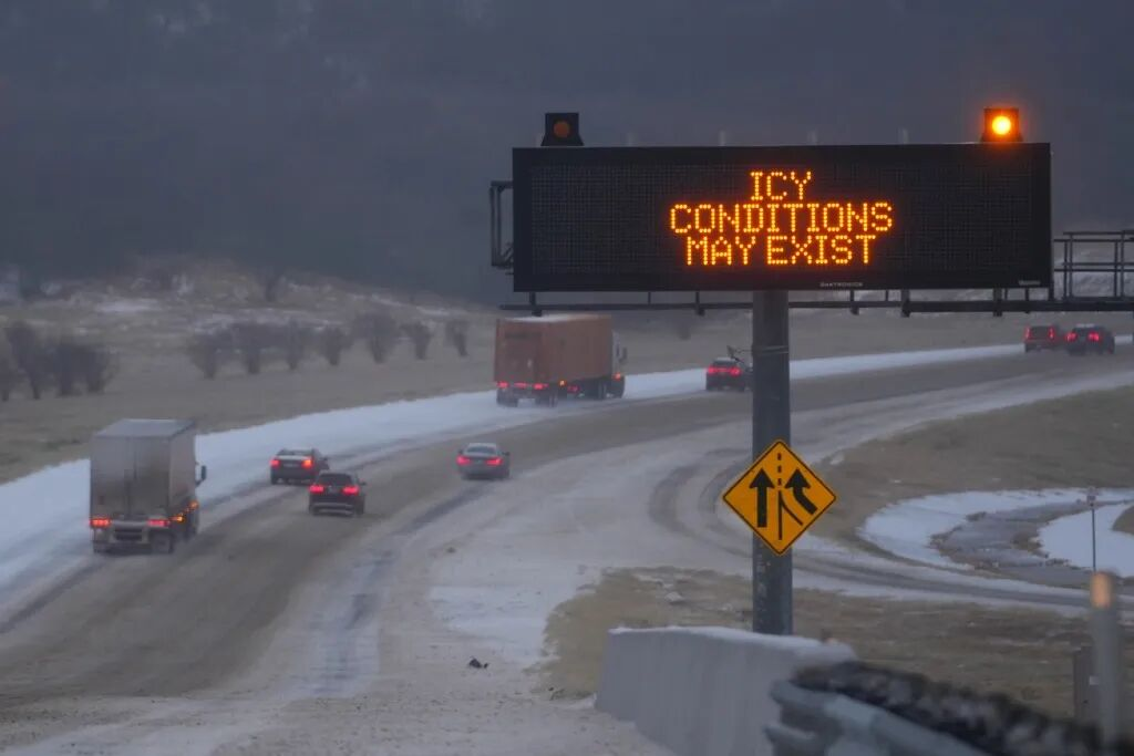 1月24日,美国达拉斯,汽车在20号州际公路上向东行驶,路边指示牌提醒司机可能出现结冰状况。