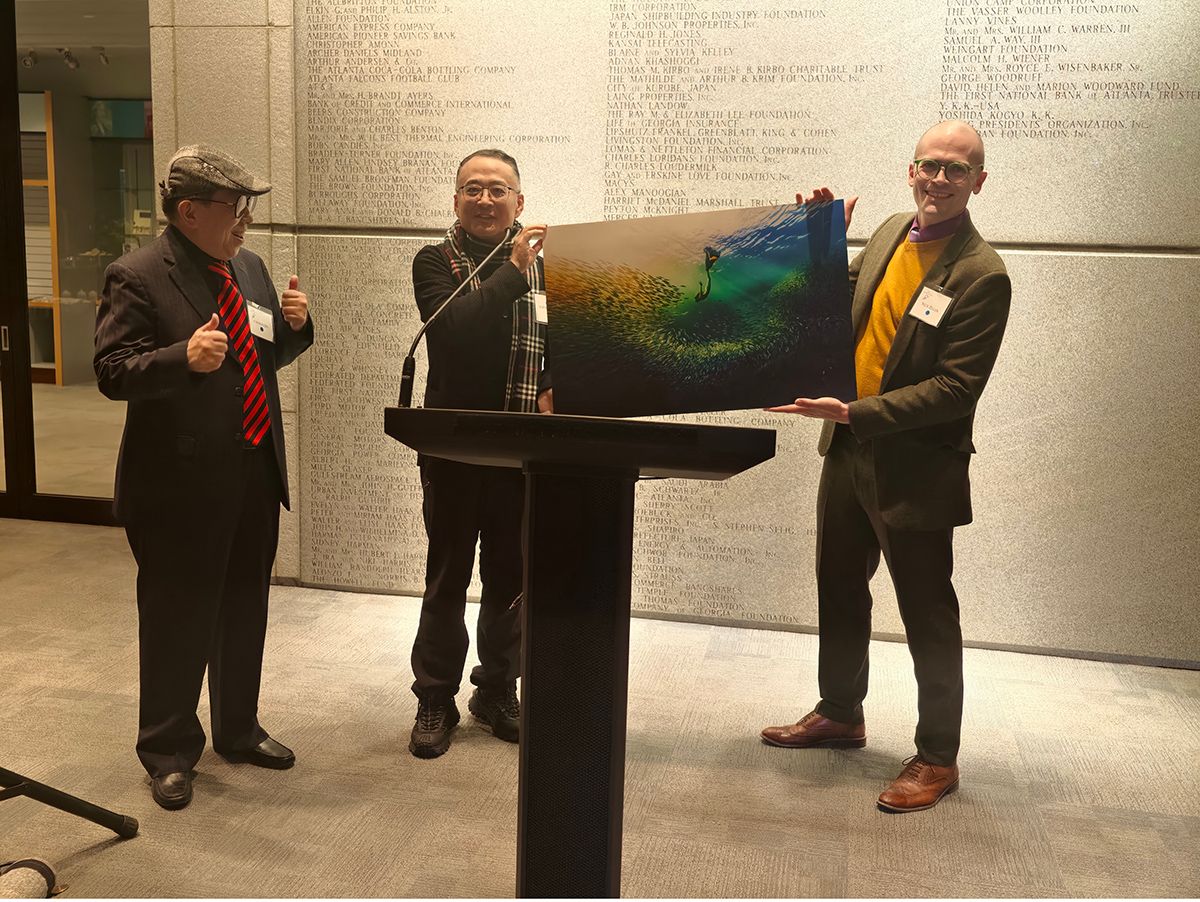 2026年1月29号,中国当代摄影艺术家岳鸿军、向荣、陈远明在美国亚特兰大卡特中心(The Carter Center)举办艺术摄影展,集中呈现三位艺术家近年来具有代表性的摄影与视觉艺术作品。展览以当代影像语言为媒介,探讨自然、人文与个体经验之间的深层关系,展现中国摄影艺术在全球语境中的多元表达。值得一提的是,三位艺术家在展览期间各向卡特中心捐赠一组代表性摄影作品,作为永久收藏,用于公共文化展示与学术交流。作品通过对海洋生态与生命形态的深度记录,展现人与自然之间细腻而深刻的共生关系。本次展览中,岳鸿军带来其极具国际影响力的水下摄影作品。作为曾在中国美术馆举办个人摄影展的艺术家,此次展览亦是其摄影作品首次在美国呈现。作品通过对海洋生态与生命形态的深度记录,展现人与自然之间细腻而深刻的共生关系。图为2026年1月29日,美国亚特兰大,中国著名海洋摄影家,深圳大鹏新区珊瑚保育志愿联合会会长岳鸿军向卡特中心捐赠摄影作品。