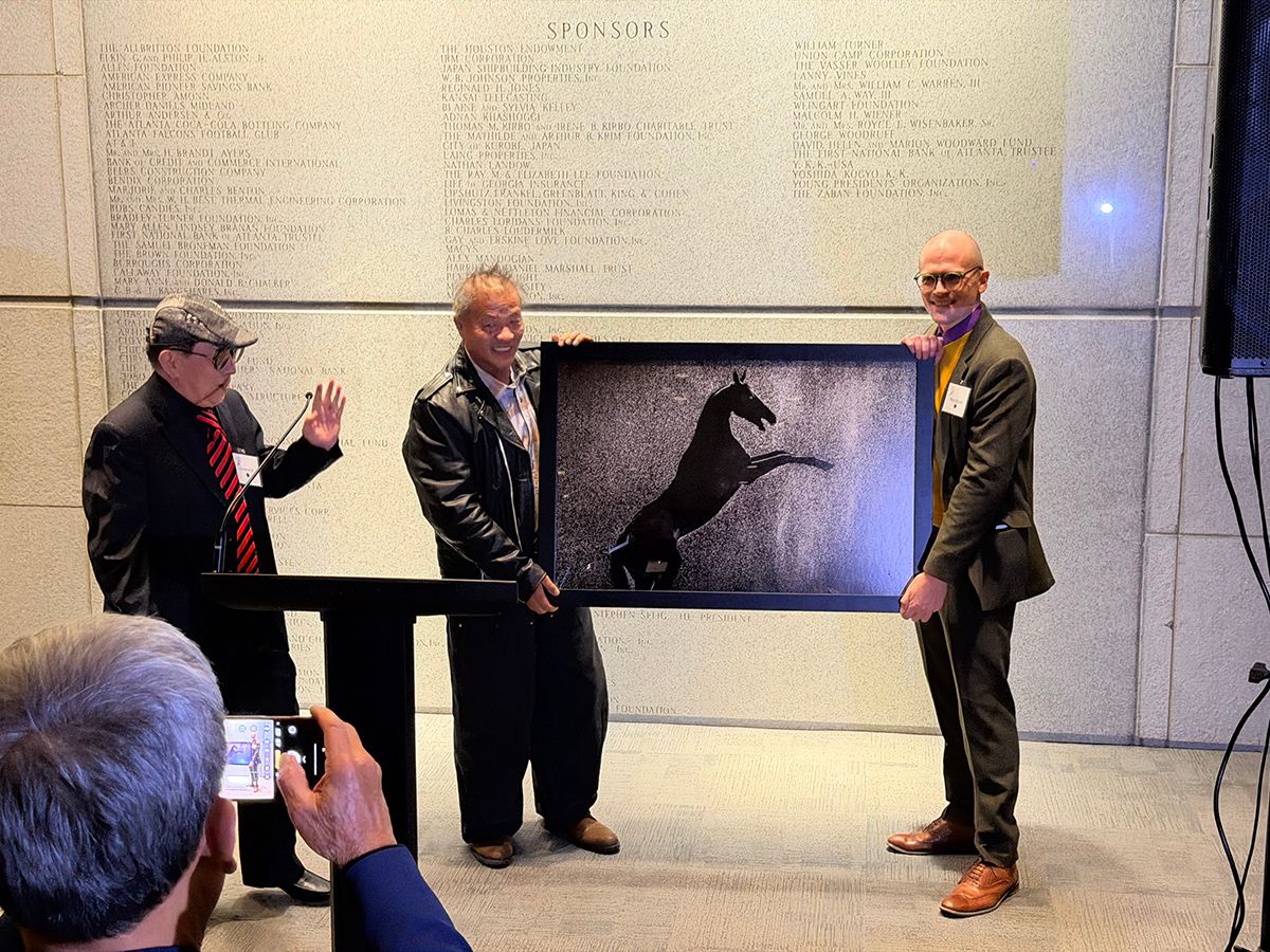 陈远明以其标志性的视觉叙事方式,将旅行、动物与人类文明融入宏大的影像结构之中,形成富有史诗感的当代摄影语言。其参展作品在刚刚亮相成都第三届国际摄影周后,随即空运至美国参展,延续了作品在国际艺术舞台上的持续呈现与流动。图为2026年1月29日,美国亚特兰大,中国当代摄影领军人物王庆松代表陈远明给卡特中心捐赠摄影作品。