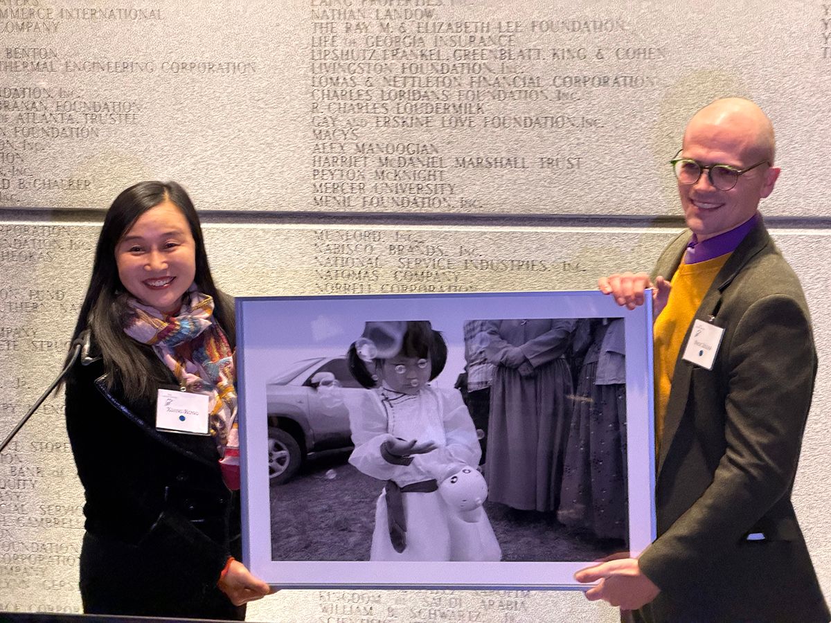 向荣则以兼具审美力量与女性视角的摄影作品,呈现当代女性在生活与创作中的独立精神。继不久前在上海艺术画廊举办个人摄影展之后,此次亦是她首次在美国展示其摄影作品,标志着其艺术创作在国际语境中的重要亮相。图为2026年1月29日,美国亚特兰大,中摄协会员女企业家,企业收藏家俱乐部成员向荣给卡特中心捐赠自己的摄影作品。图/Sipaphoto(中新网)