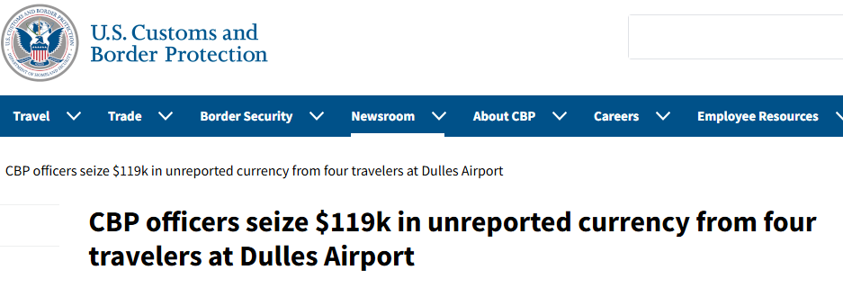 自1月4日以来,美国海关和边境保护官员在华盛顿杜勒斯国际机场从四名国际旅客身上查获了119,178美元未申报的现金。